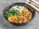 Pan seared seitan, earthy cremini mushrooms braised in a rich marsala wine sauce. Served with mashed potatoes and sauteed spinach.